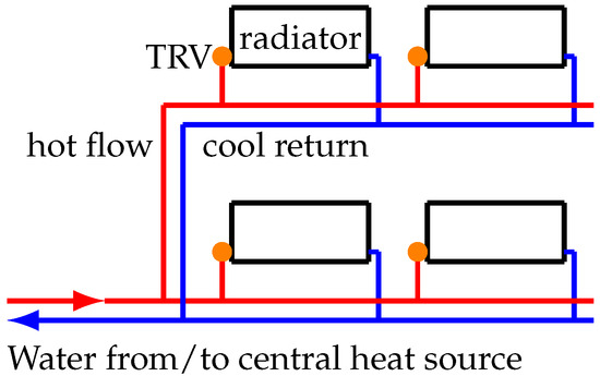 A TRV enforces a nominal maximum room set-point or target temperature. As the room (and thus air) temperature around the TRV rises, the TRV restricts and eventually stops water flow through the radiator, thus reducing heat input to the room. Simple mechanical TRVs may use a wax- or oil-filled bulb bearing down on a valve pin. As the air around the valve warms, the bulb expands, the pin is pushed down, and the flow of water through the radiator is reduced, thus closing a regulating negative temperature ’thermostatic’ feedback loop. As in [13], a "smart" TRV control mechanism may include a microcontroller to react to and anticipate occupancy, for example, to further reduce heat demand in vacant areas. Typically, radiators draw their hot water in parallel from the central heat source; see Figure 1.