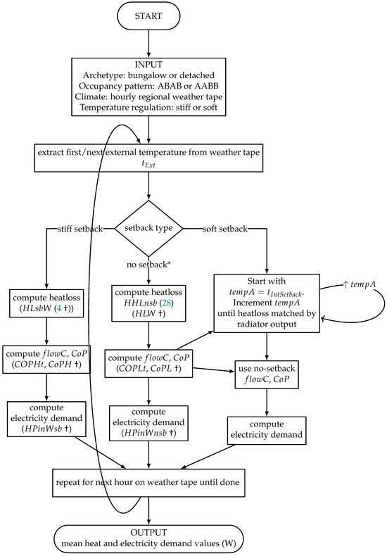 Summary flowchart overview of model operation. “Stiff” regulation and all items marked † are as [48], “soft” regulation is weather compensation. * no-setback computation is used to discover flow temperature (for weather compensation) before soft setback computation.