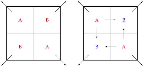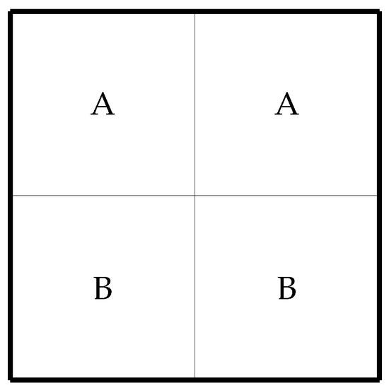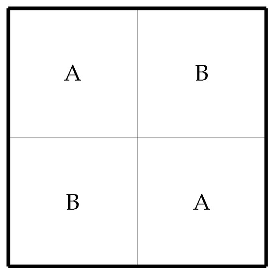 Figure 3. “ABAB” layout of rooms in the initial model “bungalow” as seen from above. A rooms are always at 21 °C. B rooms can have their temperature set back to 18 °C. B rooms may be unoccupied, or bedrooms kept cooler for sleeping comfort. All external walls around the perimeter are identical, and all internal walls are identical and less well insulated than external walls. - The outside world is at UK winter design temperature ().