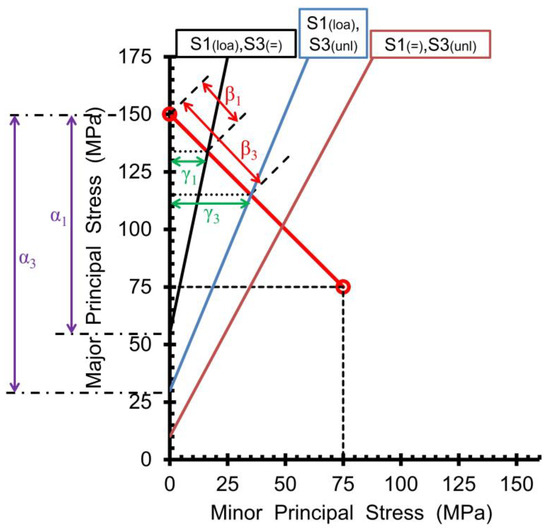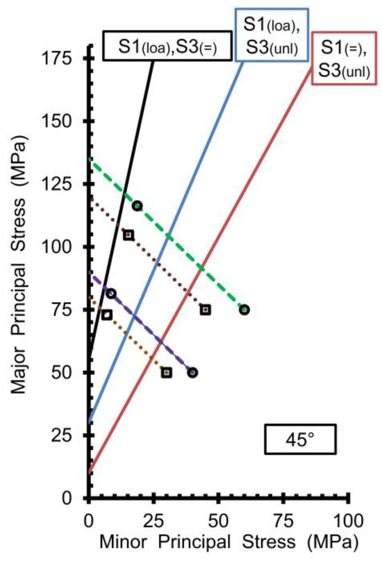 The three failure envelopes are clearly separated (Figure 1). The one that corresponds to the uniaxial loading (S1(loa),S3(=)) results in the strongest strength; e.g., for a zero-confining pressure, the failure load is 55 MPa (Table 1a). The failure envelope of the simultaneous loading and unloading stress paths (S1(loa),S3(unl)) is situated between the uniaxial loading (S1(loa),S3(=)) and uniaxial unloading (S1(=),S3(unl)) envelopes. The strength reduction along the stress path, when comparing the failure load of the uniaxial unloading stress path with the uniaxial loading stress path, is situated between 41% and 43% (Table 1b). A comparison between the simultaneous loading and unloading stress paths and the uniaxial loading shows a strength reduction between 28% and 34% (Table 1c). (Further, these differences are compared to the experimental results published in [8]).