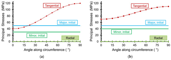 Stress redistribution along borehole wall for the initial anisotropic stress state. (a) 50 and 30 MPa; (b) 50 and 40 MPa. 0° corresponds to orientation of initial major principal stress (Figure 5).