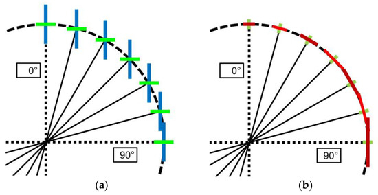 In comparison to an initial isotropic stress state, the stress redistribution around a borehole for the initial anisotropic stress state is more complex. The tangential stress is different in each point of the circumference (Figure 4) (to be precise, per quarter of the circumference). The two extreme values are reached on the two radial lines that correspond to the orientation of the initial major and minor principal stresses, i.e., for the angles of 0° and 90°, respectively. For these two angles, the orientation of the principal stresses does not change, i.e., it is always in the radial and tangential direction in comparison to the borehole (Figure 5). Along any other radial line, the principal stress orientations before drilling are different from the principal stress orientations on the circumference of the borehole wall. The latter are always radial and tangential. For the radial line that corresponds to the orientation of the minor principal stresses (i.e., 90° in Figure 4 and Figure 5), this orientation (i.e., radial orientation) remains the orientation of the minor principal stress. However, for the radial line that corresponds to the orientation of the major principal stresses (i.e., 0°), this orientation (i.e., the radial orientation) evolves from the major to the minor principal stress orientation. All of these aspects should be considered when analysing the RVE behaviour.