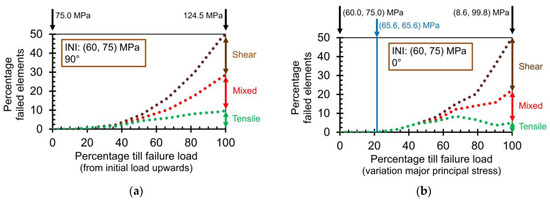 Variation in the contact failure modes (i.e., tensile-only, shear-only, and mixed modes) as a function of the stress path, i.e., from the initial stress state of (60, 75) MPa till the load level of failure, corresponding to 50% failed contacts. (a) 90° angle (see Figure 5); (b) 0° angle.