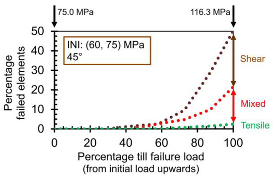 Variation in the contact failure modes (i.e., tensile-only, shear-only, and mixed modes) as a function of the stress path, i.e., from the initial stress state of (60, 75) MPa till the load level of failure, corresponding to 50% failed contacts. Information is for an angle of 45°.