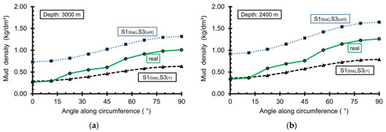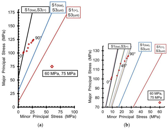 In Table 4, the minimum mud weight is calculated as a function of the angle. Two cases are considered for the initial stress state of (60, 75) MPa. The first case is the case in which the initial major principal stress of 75 MPa corresponds to an approximate depth of 3000 m (Figure 13a). As explained above, this could be a horizontal borehole or a vertical borehole at that depth, whereby the major horizontal principal stress is equal to the vertical (axial) stress. Second is the case in which the initial minor principal stress of 60 MPa corresponds to an approximate depth of 2400 m (Figure 13b). The main reason to consider both depth values is to obtain a good idea about the impact on the critical mud weight.