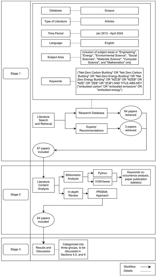 The first step involved retrieving articles from the Scopus online database, selected for its broad access to academic resources, with increasing use from various countries and knowledge domains [13]. The search utilized a specific set of keywords within titles, abstracts, and keywords of the papers. The following set of keywords was used: (TITLE-ABS-KEY (“Net-Zero Carbon Building” OR “Net Zero Carbon Building” OR “Net-Zero Energy Building” OR “Net Zero Energy Building” OR “NZCB” OR “NZEB” OR “NZE” OR “ZEB” OR “ZCB”) AND TITLE-ABS-KEY (“embodied carbon” OR “embodied emissions” OR “embodied energy”)). This initial search yielded 110 papers from Scopus. Subsequently, English-language papers were reviewed for their relevance to the research theme and category of literature, the time period, and the subject matter. The literature search commenced in January 2013, including only “articles” published until April 2024, and covered subject areas in “Engineering”, “Energy”, “Environmental Science”, “Social Sciences”, “Materials Science”, “Computer Science”, and “Mathematics”. Applying these filters, a total of 64 papers were exported into a spreadsheet for further bibliometric analyses. In the next step, the bibliometric analyses aimed to assess the connection of the identified papers to the research topic using keyword co-occurrence mapping, year-on-year publication trends, top research topics, and region-wise publications.