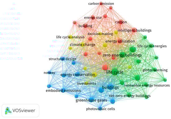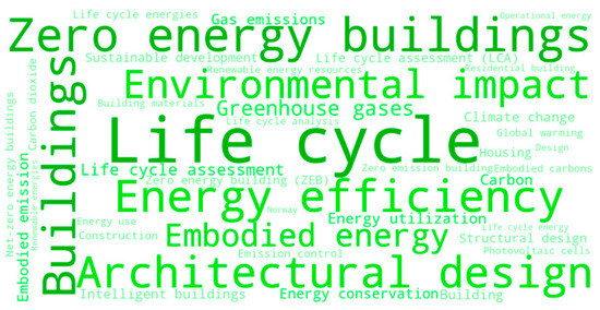 To effectively highlight the key terms and enhance comprehension of the core concepts, a word cloud, as shown in Figure 3, is created based on index keywords and their occurrences. In this visual representation, the relative size of each word corresponds to its frequency of occurrence, allowing more common terms to appear in larger fonts. Dominating the visualization, “Life cycle” emerges as the most recurrent term with 34 mentions, followed by “Zero energy buildings”, which appears 24 times, and “Buildings” is noted 23 times. Additionally, terms like “Energy efficiency”, “Architectural design”, “Environmental impact”, and “Embodied energy” are also significantly featured due to their frequent mentions.