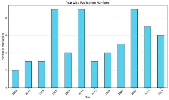 Table 2 and Figure 5 display the distribution of publications by year within the research area of interest for the papers retrieved from the database, showcasing the trends in research output over time. There are overall fluctuations in the number of publications from year to year, with some years showing similar numbers. On the other hand, these data reveal increases in research activities, notably in the years 2016, 2018, 2022, and 2023, indicating periods of heightened interest and activity in the field.