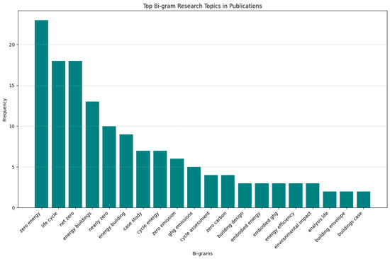 Additionally, to analyze the trends in research topics, the study employs bi-grams instead of single words within the publication titles. In this context of study, a bi-gram is defined as a pair of consecutive words derived from a sequence of tokens. Table 3 and Figure 6 summarize the occurrence of bi-gram words, drawing attention to “zero energy”, “life cycle”, and “net zero” as the three most frequently mentioned topics. This approach provides an understanding of the themes and areas of focus in the research.