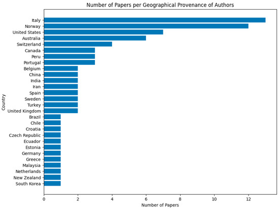 To examine the geographical origins of the authors, country names are extracted from the papers’ affiliation information. This information provides details about the likely geographical locations of the authors. The data are organized to quantify the scholarly contributions by country based on the number of papers produced. In the dataset of publications, a total of 28 distinct regions are present. This analysis reveals that Italy and Norway lead in contributions, with a total of 13 papers and 12 papers, respectively. They are followed by the United States, with a total of seven, Australia, with a total of six, and Switzerland, with four. Notably, Canada, Peru, and Portugal have three papers each, while Belgium, China, India, Iran, Spain, Sweden, Turkey, and the United Kingdom have a count of two papers each. The results are presented in Table 4, listing the countries and their respective paper counts. Additionally, Figure 7 offers a visual representation of the distribution.
