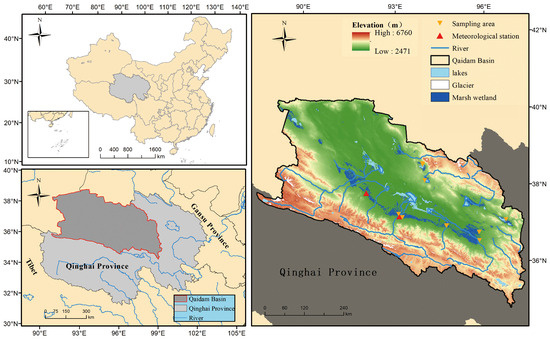 The climate of the Qaidam Basin is characterized by cold and arid conditions, with limited precipitation, strong winds, extended period of sunshine, intense solar radiation, and favorable light quality. The average annual temperature is 4.1 °C, and the average annual precipitation is 93.7 mm. In recent 30 years, both temperature and precipitation have shown an obvious rising trend [45]. The average wind speed is high, leading to numerous windy days, reflecting the distinctive features of a continental desert climate and a highland climate [46]. Lakes, marsh wetlands, and grasslands in the basin are mainly distributed in lower flat areas with lower elevations. Glacier meltwater from the mountains serves as a water source for the basin’s water systems and nurtures the marsh wetlands and grasslands in the region [38].