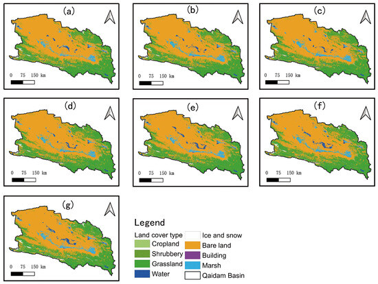 (a–g) depict the land cover of the Chaidamu Basin for the years 1990, 1995, 2000, 2005, 2010, 2015, and 2020, respectively.