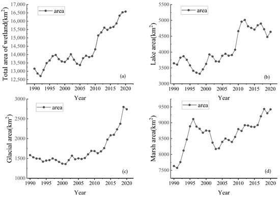 The area (km2) of (a) wetlands, (b) river and lake wetlands, (c) glacier wetlands, and (d) marsh wetlands within the basin.