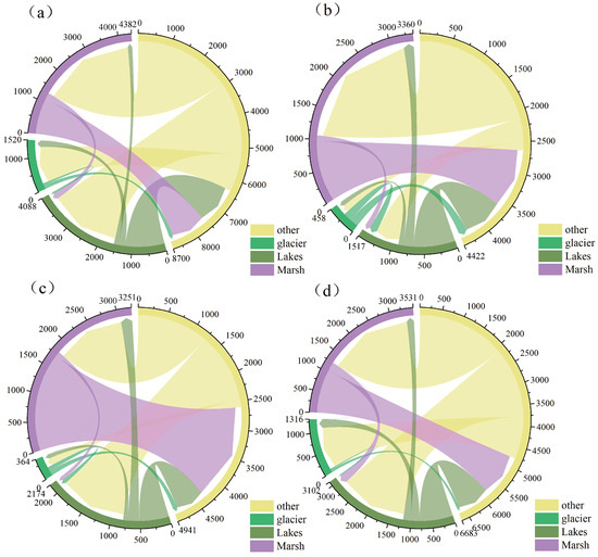 Figure 5 illustrates the wetland transitions over the entire period (a) and during growth period I (b), the fluctuation period (c), and growth period II (d) within the basin using a chord diagram. In the entire period (1990–2020), the area transitioning from other types to wetlands was the largest (2287 km2), while the area transitioning from glaciers to lake wetlands was the smallest (59 km2). The total area transitioning from other types to wetlands is 6360 km2, while the total area transitioning from wetlands is 2421 km2. Internally, the most substantial transition is from lakes to glaciers (205 km2), while the transition between marshes and glaciers is minimal. During growth period I (1990–1997), the most significant transition is from other types to marsh wetlands (2137 km2), and the least significant transition is from lakes to glaciers (76 km2). The total area transitioning from other types to wetlands is 2645 km2, and the total area transitioning from wetlands is 1779 km2. Internally, the most substantial transition is from lakes to marshes (167 km2). In the fluctuation period (1998–2007), the most significant transition is from other types to marsh wetlands (1732 km2), and the least significant transition is from glaciers to lakes (74 km2). The total area transitioning from other types to wetlands is 2605 km2, while the total area transitioning from wetlands is 2339 km2. Internally, the most substantial transition is from lakes to marshes (204 km2). In growth period II (1998–2020), the most significant transition is from other types to marsh wetlands (2102 km2), and the least significant transition is from glaciers to lakes (25 km2). The total area transitioning from other types to wetlands is 4790 km2, and the total area transitioning from wetlands is 1895 km2. Internally, the most significant transition is from lakes to glaciers (215 km2). Comparing the wetland transitions during growth period I, the fluctuation period, and growth period II, it is evident that transitions to lakes and transitions to glaciers both increased, while transitions from glaciers to lakes decreased. Specifically, transitions to lakes increased by 834 km2 in the fluctuation period compared to growth period I, and transitions to glaciers increased by 876 km2 in growth period II compared to the fluctuation period. The least significant transition occurs from other types to marshes during the fluctuation period (1244 km2), and the transition from lakes to glaciers increases by 140 km2 in growth period II compared to the fluctuation period. Overall, wetland area transitions are substantial during each period and over the entire period.