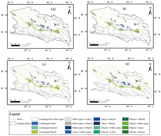 The spatial distribution of wetland mutual transitions within the Qaidam Basin, including (a) 1990–2020, (b) 1990–1997, (c) 1998–2007, and (d) 2008–2020.