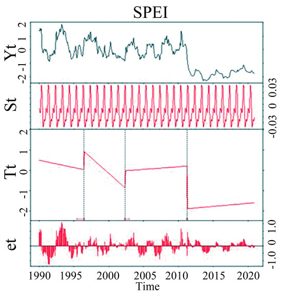 Here, denotes the observation time. represents the observed value at time , and is the seasonal component, which can be used to monitor cyclical changes in the time series on an annual scale. is a long-term trend component, generally used to detect gradual changes in time series data over a year, with potential discontinuities during the change process. is the residual component, consisting of the variability caused by observational methods and atmospheric conditions, that is, the change component other than the trend and seasonal components. Given the long-time scale of the SPEI12, this paper only employs the BFAST method to detect the trend component features of SPEI12, without discussing the seasonal or cyclical component features.