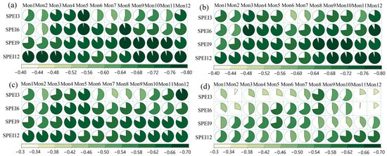 The relationship between wetland area and SPEI3, SPEI6, SPEI9, and SPEI12 from 1990 to 2020, including (a) wetlands, (b) river and lake wetlands, (c) glacier wetlands, and (d) marsh wetlands within the basin.