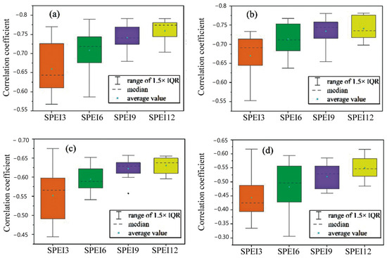 Statistical values of correlation coefficients between wetland area and SPEI, including (a) wetlands, (b) river and lake wetlands, (c) glacier wetlands, and (d) marsh wetlands within the basin.