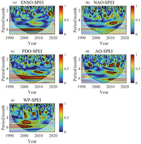 SPEI12’s response to atmospheric circulation, including (a) ENSO-SPEI, (b) NAO-SPEI, (c) PDO-SPEI, (d) AO-SPEI, and (e) WP-SPEI.