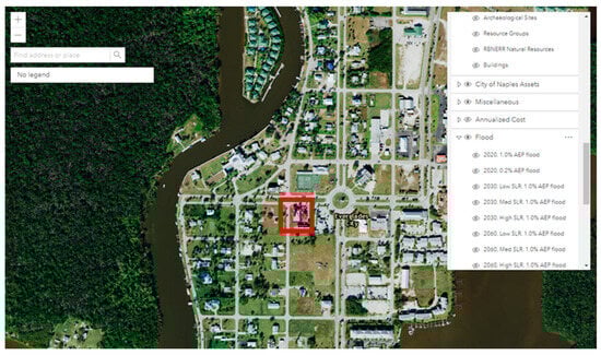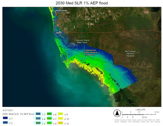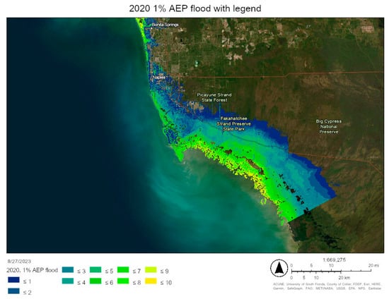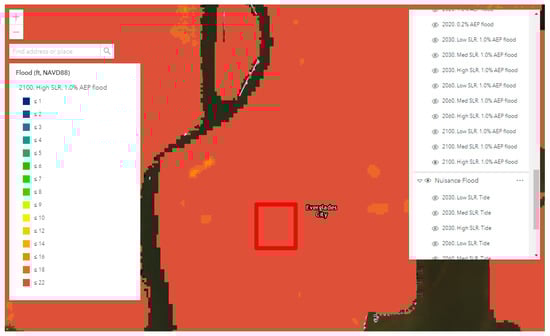 Products contained in the ACUNE Geo Tool include probabilistic flood maps and nuisance tide maps for current and future climate conditions in the 21st century, incorporating the effects of sea-level rise and hurricane-induced storm surges and waves, as well as the influence of vegetation, which changes under the influence of climate change [44,45]. These products are produced using an integrated modeling system, CH3D-SWAN-WARMER, based on the coupling of a three-dimensional vegetation-resolving hydrodynamic-wave model, CH3D-SWAN [46], and a vegetation model, WARMER [47]. Probabilistic coastal flood maps incorporating the effects of sea-level rise and surges and waves are produced using the JPM-OS statistical method [48] and ensembles of tropical cyclones based on historical data, as well as predictions of the best available climate models [49,50]. The ACUNE Geo Tool provides current and future 1% annual exceedance probability flood elevation (commonly referred to as 100-year flood or Base Flood Elevation) for adaptation planning. Because of the incorporation of the cumulative effect of a large ensemble of storms, the 1% flood elevation is better than the flood elevation in any specific storm, e.g., Irma in 2017, for vulnerability analysis and the adaptation planning of various infrastructures.
