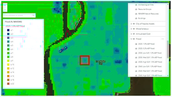Exposure scoring reflected the number of tested scenarios in which flooding from SLR, and storms was projected to impact sites. The ACUNE tool was used to map different SLR and storm flooding scenarios for the various planning horizons and projections of SLR (13 scenarios in all; Table 1). A site’s exposure score was determined as a percentage based on the number of scenarios where any portion of the site is exposed to any amount of water. The exposure scores range from 0 (not exposed in any scenario used) to 100% (exposed to water in all 13 scenarios). Below are screen captures of the ACUNE tool viewing the Everglades City Laundry Building/Everglades City Museum with no flooding (Figure 3), with flooding under 2020 climate and a 1% AEP event (the least severe flood event tested) (Figure 4), and with flooding under 2100 climate, high SLR, and a 1% AEP event (the most severe flood event tested) (Figure 5). To view all 13 scenarios tested for all 10 case study sites, please refer to the full report completed by the authors, “Collier County Cultural Resources Vulnerability Assessment,” available online at http://www.fpan.us/wp-content/uploads/2023/12/ACUNE-Collier-County-Cultural-Resources-Vulnerability-Assessment-Final-March-2022.pdf, accessed on 15 August 2023 [56].