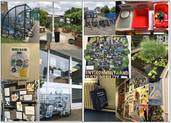 Both schools had big school grounds, including a wooded area, green fields, and a range of play areas. The photographs in Figure 1 provide an impression of both schools and their grounds. They include views of the grounds, examples of student work on public display, vegetation, a pond, cycle racks, and recycling facilities to give an idea of the schools’ contexts.
