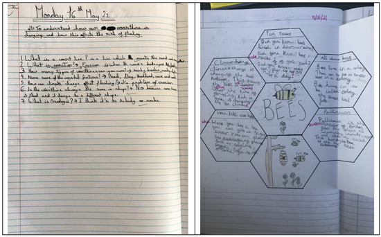 Images from student exercise books showing issues related to sustainability: School 1, Year 5 (left); School 2, Year 5 (right).