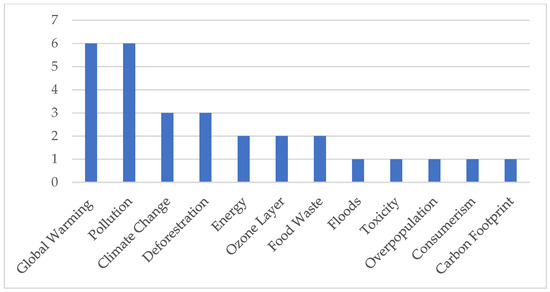 For the participants in this study, the most commonly cited environmental problems facing the world today were global warming (HT1, HT2, T1, T2, T3, S5-Yr5-Sch1); pollution (HT1, T1, T3, S3-Yr4-Sch1, S4-Yr1-Sch1, S2-Yr4-Sch1); climate change (S3-Y4-Sch1, S3-Yr5-Sch1); deforestation (T1, S2-Yr4-Sch1, S6-Yr5-Sch2); energy (ET1, ST1); ozone layer depletion (S3, S5-Yr5-Sch1); food waste (HT1, S3-Yr4-Sch1); floods (S4-Yr5-Sch1); toxicity (HT2); overpopulation (T1); consumerism (T2); and carbon footprint (ST1) (Figure 3).