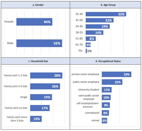 Figure 1 displays a detailed breakdown of the demographic attributes of the survey participants, highlighting the largest age group, predominant occupational statuses, and common household sizes. The most represented age group is 25–34 years, which mirrors the demographic trend in the study area, where this age group comprises a significant portion of the population. This age group is of particular relevance as they are the most active online shoppers, influencing trends in digital commerce and delivery services.