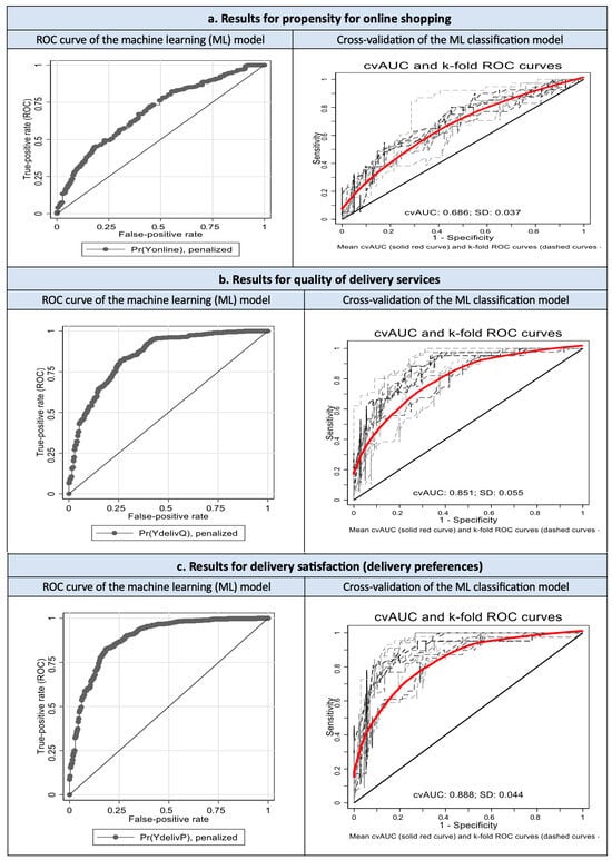 Results of Statistical Testing of the Predictive Ability of The Machine Learning Models with Cross-validation, ROC Curves, and the AUC. In relation to the predictive and classification validity of ML models, the ROC and AUC results indicate that these models have a good predictive/classification ability and properly identify the variables that affect decision-making regarding online purchases, as well as the variables that affect the perceived quality of, and customer satisfaction with, delivery services. The ROC curve of the ML model for online shopping is above the diagonal curve (Figure 2a, left). In the cross-validation of the ML model based on splitting, the machine learning model in training and test samples is above the diagonal curve 10 times recursively (Figure 2a, right). The AUC of the classification ML model for online shopping is equal to 0.686, suggesting good precision in the predictions of customers who make online purchases and those who do not. The 95% confidence interval of the AUC is between 64% and 73% for the machine learning model, estimated for the latent factor of online purchases. The AUC is even greater for the other two variables, as shown in Figure 2b,c, which indicates that the machine learning model estimated for the latent factor of satisfaction/preference regarding a delivery service is, again, a powerful machine learning model with good classification power.
