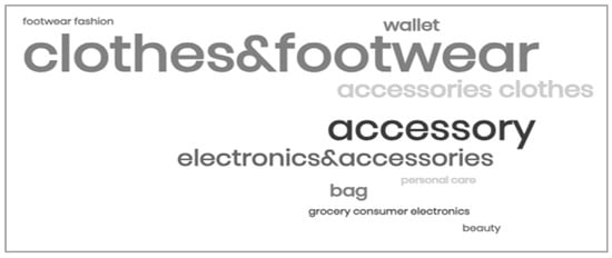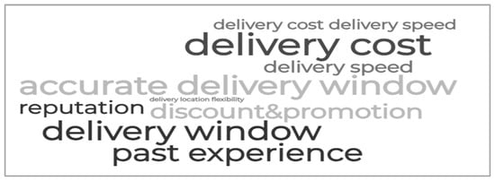 Finally, Figure 3, Figure 4 and Figure 5 use word clouds to display the most frequent customer responses in terms of the most frequent products purchased online (Figure 3), the most important factors the customers consider when choosing a delivery company (Figure 4), and the main problems commonly encountered with deliveries (Figure 5). The word clouds were generated using data collected from the online survey. The results indicate that clothes and footwear, along with accessories and electronics, are the dominant products purchased online (Figure 3).