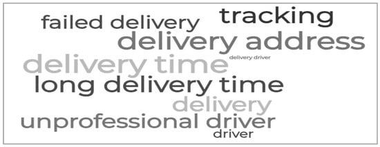 The delivery cost and speed, an accurate delivery window, and updates and tracking are among the main aspects that customers consider when choosing a delivery company (Figure 4). In terms of delivery problems, the word cloud reveals that the most frequent issues are related to not being informed about the delivery time, late or failed deliveries, the driver asking for the delivery address, and problems with there being no tracking or updates (Figure 5).