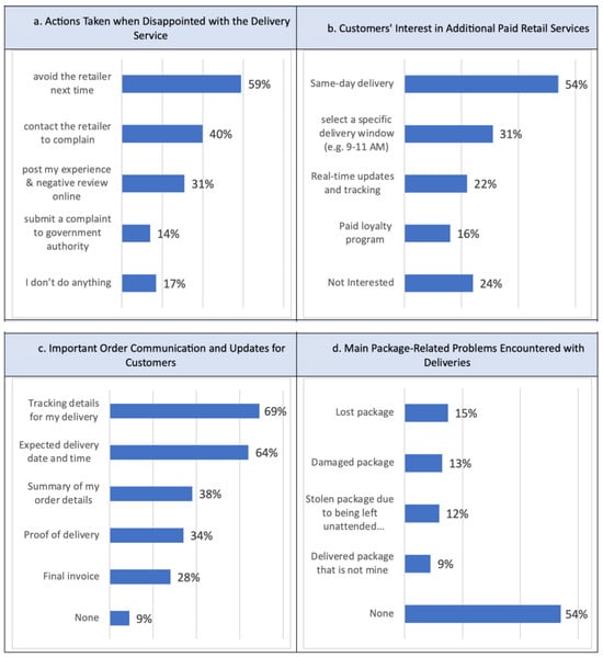 The actions taken by customers when they encounter problems with the delivery service are avoiding the retailer in future, contacting the retailer to complain, posting their experiences, and providing negative reviews online (Figure 6a). Furthermore, among those customers who choose to avoid the retailer, 44% do not take any further action, such as posting a review, complaining to the retailer, or similar actions. Such behaviour may result in a significant number of unsatisfactory delivery incidents going completely unnoticed by the retailer.