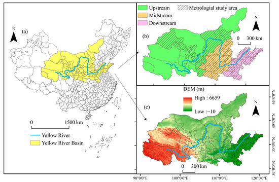 The study area. (a) Location of the Yellow River Basin in China. (b) Upstream, midstream and downstream of the Yellow River Basin. (c) Elevation of the Yellow River Basin.