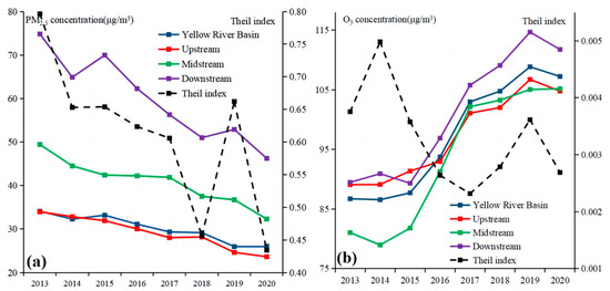 Trend of PM2.5 and O3 concentrations in the YRB during 2013–2020. (a) Trend of PM2.5 concentration in the YRB during 2013–2020. (b) Trend of O3 concentration in the YRB during 2013–2020.
