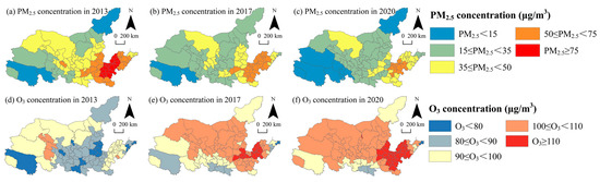 The main policy implementation period of the Action Plan for Prevention and Control of Air Pollution was 2013–2017, while that of the Three-Year Action Plan for Winning the Battle of Defending the Blue Sky was 2018–2020. Therefore, we chose 2017 as the node to observe the distribution patterns of air pollutant concentration in these two periods. There were 76 cities with PM2.5 concentrations exceeding 35 μg/m3 in 2013 (Figure 3a), where those cities with a concentration of 35–50 μg/m3 were located in the up-midstream, while those with a concentration of 50–75 μg/m3 were located in Henan, Shandong, etc. PM2.5 concentration was the highest in Hebi (91.46 μg/m3). There were 18 cities with a PM2.5 concentration above 75 μg/m3 in the downstream region. Those cities with PM2.5 concentrations exceeding the secondary limit (35 μg/m3) in the Ambient Air Quality Standard (GB3095-2012) were mainly located in the mid-downstream and resource-oriented cities in 2017, such as Shizuishan and Wuhai (Figure 3b), and there was only one city (Alashan) in the upstream region with a PM2.5 concentration exceeding the secondary limit (35 μg/m3) in 2020. In 2020, there remained only nine cities in the midstream with PM2.5 concentrations exceeding 35 μg/m3. However, there were 14 cities with PM2.5 concentrations above 50 μg/m3, mostly clustered in the downstream region, including Kaifeng, Puyang, and Heze. O3 concentration was at a relatively high level in the YRB in 2013. Cities with O3 concentrations lower than 80 μg/m3 included Yangquan, Lanzhou, Jinzhong, and Qingdao. Those cities with O3 concentrations higher than 100 μg/m3 included Zhangye and Jiayuguan. Only Weihai had an O3 concentration less than 80 μg/m3 in 2017. O3 concentrations in Inner Mongolia, Ningxia, Shaanxi, and Shanxi generally exceeded 100 μg/m3, while those in some cities in Henan and Shandong exceeded 110 μg/m3 in 2017. Two major agglomeration areas of O3 concentration were formed. The high-value cluster areas with O3 concentrations exceeding 110 μg/m3 covered western Shandong and eastern Henan. There were three cities with O3 concentrations below 90 μg/m3: Weihai, Hanzhong, and Ankang.