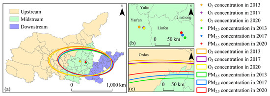 Due to the shape of the YRB, flowing from west to east, combined with the distribution of air pollutant concentrations, where the high-concentration regions are mainly clustered in the downstream, the SDE for both showed a northwesterly–southeasterly direction, and the SDE of each parameter remained essentially the same, with a small change in the YRB during 2013–2020 (Table 3). Specifically, the area of the SDE of PM2.5 concentration increased gradually. The semimajor axis decreased and then increased, while the semiminor axis continued to increase. The overall change dimension of the axis was essentially the same. The rotation also presented a tendency of decreasing and then increasing. This indicated that PM2.5 concentration agglomeration in the YRB decreased slightly, while that in its northwestern and southeastern parts decreased gradually, pushing the SDE to rotate clockwise. The area of the SDE of O3 concentration decreased gradually. The semimajor axis decreased and then increased, while the semiminor axis decreased continuously, and the rotation remained stable. This indicated that O3 concentration agglomeration in the YRB increased during 2013–2020. The cities with high O3 concentrations gradually gathered in the mid-downstream regions. The center of gravity of PM2.5 concentration migrated 11.91 km to the northwest during 2013–2017 and then migrated a further 9.24 km to the northwest during 2017–2020. This indicated that PM2.5 concentration decreased in the mid-downstream regions. The center of gravity of O3 concentration migrated 15.61 km to the southeast during 2013–2017 and then continued to migrate slightly to the southeast (by 2.33 km) during 2017–2020. This indicated that the O3 concentration in the mid-downstream regions tended to aggregate. The center of gravity of PM2.5 concentration was distributed to the northwest of that of O3 concentration. Starting from 2013, the centers of gravity of the two pollutants’ concentrations continuously migrated to the northwest and southeast, respectively. The distance between their centers of gravity reduced by 30.03 km (nearly 19.05%), with a distance of only 127.61 km in 2020. This indicates that PM2.5 concentration gradually decreased and O3 concentration increased in mid-downstream regions of the YRB. (See Figure 4).