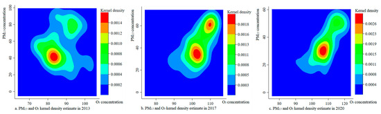 BKD is the kernel density estimation of a two-dimensional random variable, which is a nonparametric test method [55]; it is a kind of distributed dynamic method, which is a nonparametric estimation method for studying regional differences. This method does not presuppose the existence of some functional relationship between economic variables, but it estimates the density function according to the characteristics of the variables themselves, so there is no case that the parameter model cannot fit the data well, meaning that more general conclusions can be drawn [55]. BKD plots are an important method to analyze the joint distribution of two variables, and the dispersion and aggregation characteristics of the two air pollutants can be observed more clearly [56]. By drawing the BKD plots of PM2.5 and O3 concentrations, regional clustering differences and synergistic evolution in the YRB can be discussed.