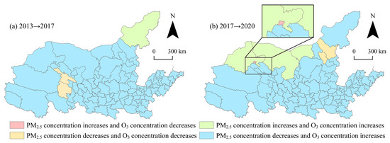 Figure 6 demonstrates that the trend of decreasing PM2.5 concentration and increasing O3 concentration was observed in most of the cities during 2013–2017, while a decrease in PM2.5 and O3 concentrations appeared only in the Tibetan Autonomous Prefectures of Hainan and Haibei. The PM2.5 and O3 concentrations increased in Xilingol League. Meanwhile, there was no city where PM2.5 concentration increased and O3 concentration decreased. Most cities still showed a pattern of decreasing PM2.5 and increasing O3 concentration during 2017–2020, with only Hohhot and Ulanqab showing decreases in both PM2.5 and O3 concentrations. PM2.5 and O3 concentrations increased in Alashan League, Jiuquan, and Bayannur. In Jiayuguan, PM2.5 concentration increased while O3 concentration decreased during 2017–2020.