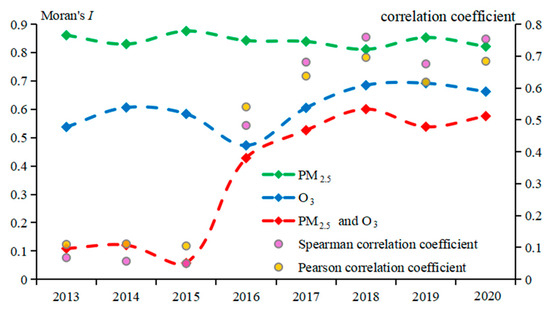 Correlation coefficient and Moran’s I of PM2.5 and O3 concentrations.