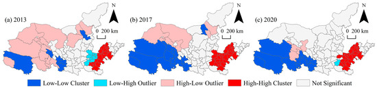 We plotted a bivariate LISA clustering map of the two pollutants’ concentrations in the YRB using Geoda1.22 (Figure 8). A total of 17 cities with high–high clustering of the two pollutants accounted for 18.89% of the cities in the YRB in 2013, most of which were distributed in its downstream. The distribution of low–low clusters was relatively decentralized, with four small-scale clusters identified: Hohhot–Shuozhou, Xining–Haidong, Dingxi–Tianshui–Longnan, and Yushu Tibetan Autonomous Prefecture. The cities with high O3 concentrations and low PM2.5 concentrations were distributed in the upstream region, accounting for 13.33% of the cities in the YRB. The eight cities with high PM2.5 concentrations and low O3 concentrations were located in Henan and Shanxi. The spatial auto-correlation of the two pollutants’ concentrations changed in 2017. The low–low cluster areas increased to 12 cities and showed a centralized distribution in the upstream region, mainly including Qinghai Province, Longnan, Tianshui, and Baotou. The high–high cluster areas also gradually expanded, accounting for 30.00%. The original region with a high PM2.5 concentration and a low O3 concentration was transformed into a high–high cluster of the two pollutants. Thus, there were no cities with high PM2.5 concentrations and low O3 concentrations in 2017. The number of agglomerating cities with high O3 concentrations and low PM2.5 concentrations decreased to six, showing two small-scale agglomerations, namely, Zhangye–Wuwei–Jiuquan–Alashan League, and Hohhot–Ulanqab. The spatial auto-correlation of the two pollutants’ concentrations changed again in 2020. The areas of low–low clustering changed; Xining, Baotou, and the Tibetan Autonomous Prefectures of Hainan and Haibei exited the low–low cluster areas, while Linxia and Tianshui entered the low–low cluster areas. The areas with high O3 concentrations and low PM2.5 concentrations further decreased, leaving only Wuwei, Xining, and the Tibetan Autonomous Prefectures of Hainan and Haibei. There was only one city (Luoyang) with a high PM2.5 concentration and a low O3 concentration in 2020. Only 23 cities remained in the high–high cluster area in 2020.