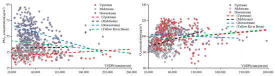 Combined with the EKC between economy and air pollution (Figure 11), a critical transition period for environmental quality improvement appears in the YRB [50]. The inflection point at which PM2.5 concentration begins to decrease with per capita GDP in the YRB is 15,242 RMB, while there are different and specific inflection points in various sub-watersheds. The inflection point in the downstream region (27,662 RMB) is higher than that in the midstream (17,969 RMB) and upstream (8685 RMB) regions. The highest inflection point of per capita GDP occurred in the downstream region (27,662 RMB), mainly because, in the early stages, in exchange for rapid economic development, large amounts of air pollutants were discharged [62], resulting in a relatively slow process of air pollution mitigation. However, we need to be alert to the risk of PM2.5 concentration rising again in the YRB. There is a risk of elevated air pollution emissions with the slowing down of economic growth rate, and a risk in the up-midstream regions undertaking the transfer of polluting industries from the downstream region [46]. The EKC indicates that PM2.5 concentration has gradually decreased, although there is still a certain distance from the lifting inflection point. It is necessary to prevent this pollutant’s concentration from rising again [47]. The inflection point of O3 concentration changing from decreasing to increasing with per capita GDP is 18,118 RMB in the YRB. Therefore, the inflection point of increasing O3 concentration (18,118 RMB) is higher than that of decreasing PM2.5 concentration (15,242 RMB), indicating that the mitigation of O3 pollution takes place later than that of PM2.5 pollution (Figure 11). Existing studies have also concluded that as PM2.5 concentration increases, O3 concentration also decreases, and the decrease in PM2.5 takes place earlier than for O3 concentration [15]. However, there are some differences in the specific inflection points in different sub-watersheds. The main thing to note is that the inflection point of O3 concentration increase in the downstream region (31,059 RMB) is still higher than that in the midstream and upstream regions (20,024 RMB and 12,635 RMB, respectively), which is consistent with the overall spatial pattern. Currently, O3 concentration is still in a state of pollution deterioration in the YRB, which is also a vital factor restricting the sustainable development of the YRB [47]. According to the EKC, the inflection point where O3 concentration changes from increasing to decreasing with per capita GDP is 141,712 RMB in the YRB, which is lower than the inflection point at which PM2.5 concentration changes from decreasing to increasing in the YRB (156,315 RMB). Currently, there still exists a large gap between economy and better air quality in the YRB, so it is expected that O3 concentration will decrease first and PM2.5 concentration will increase [63]. The inflection point of O3 concentration reduction is 141,572 RMB in the downstream region, which is higher than that in the up-midstream regions (133,944 RMB and 109,887 RMB, respectively). However, if O3 concentration is to be reduced across the board, great efforts will need to be made in all sub-watersheds. In particular, economy is relatively weak in the upstream region, for the sake of achieving coordinated progress in ecological improvement and sustainable development; only the implementation of integrated and coordinated air pollution control [48] can better promote high-quality development in various sub-watersheds.