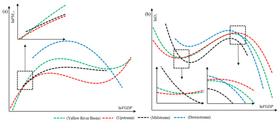 The correlation between economy and PM2.5 concentration shows a significant three-stage “N-shaped” curve in the upstream region (Figure 10a). When per capita GDP is lower than 8685 RMB, if per capita GDP increases by 1%, the PM2.5 concentration will increase by 13.55%, and when it ranges from 8685 RMB to 13,813 RMB, PM2.5 concentration will decrease by 1.32% if per capita GDP increases by 1%. When per capita GDP exceeds 131,813 RMB, the PM2.5 concentration will increase again by 0.04% if per capita GDP increases by 1%. The sensitivity of the effect of per capita GDP on PM2.5 concentration in the upstream is weaker than that in the overall YRB. The upstream air pollution base is better than those of the mid-downstream, and the economic growth is relatively slow, so the effect of per capita GDP on air pollution is relatively weak [48]. The correlation between economy and PM2.5 concentration in the midstream region also shows a three-stage “N-shaped” curve. When per capita GDP in the midstream region is lower than 17,969 RMB, if per capita GDP increases by 1%, the PM2.5 concentration will increase by 37.02%. Meanwhile, when it ranges from 17,969 RMB to 102,881 RMB, if per capita GDP increases by 1%, PM2.5 concentration will decrease by 3.49%. When per capita GDP is more than 102,881 RMB, PM2.5 concentration will increase again by 0.11% if per capita GDP increases by 1%. The sensitivity of the effect of per capita GDP on PM2.5 concentration in the midstream is stronger than that in the upstream and the overall YRB. The correlation between economy and PM2.5 concentration is in accordance with the EKC theory, showing an inverted “U-shape”. If per capita GDP increases by 1%, the PM2.5 concentration will increase by 1.70% when per capita GDP is lower than 27,662 RMB in the downstream region. When per capita GDP exceeds 27,662 RMB, PM2.5 concentration will decrease by 0.08% if per capita GDP increases by 1% in the downstream region. Existing studies have explored the impact of digital economy on PM2.5 concentration. There are more high-pollution enterprises, and the ecological environment governance pressure is greater, and PM2.5 concentration is declining more rapidly in the midstream region. The higher population urbanization and the stronger economic development in the downstream region can also better improve air pollution [40], which is broadly consistent with our results.