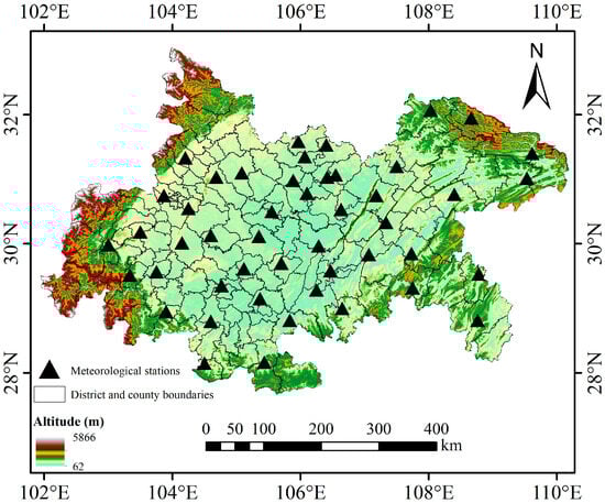 Overview of the study area (GS (2022) No. 1873). The research area spans Sichuan and Chongqing, and the black triangle in the picture shows the location of the meteorological stations.