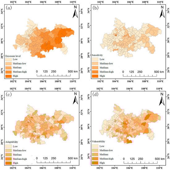 Distribution of high-temperature heat wave exposure, sensitivity, adaptability, and vulnerability in the Chengdu-Chongqing Area. (a) shows the spatial distribution of high temperature exposure levels, (b) shows the spatial distribution of regional sensitivity, (c) shows the spatial distribution of regional adaptability, and (d) shows the spatial distribution of overall vulnerability.