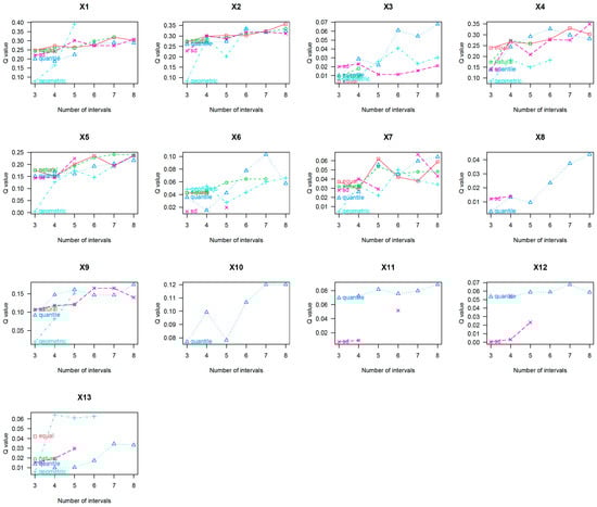 Parameter matching occurs when the q-values of each factor are at their maximum (where the abscissa indicate different ways of categorization. The vertical coordinates show the factor interpretations of the different categorizations under the different classifications. Different colored lines represent different classification methods. The purple line segment is sd, the deep blue line segment is quantile, the light blue line segment is geometric, the green line segment is natural, and the red line segment is equal).