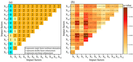 Double factor interaction detection results ((a) shows the form of factor interaction and (b) shows the q-value after factor interaction; the horizontal and vertical coordinates represent the corresponding relationships between different interaction factors).