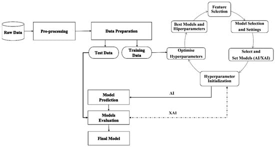 The structure of the study, the dataset used, and the machine learning and artificial intelligence methods employed are presented in this section. To ensure the study’s reproducibility and enhance the methodology’s transparency, each method and the parameters used are detailed extensively. Scientific justifications for the selection of each material and method were thoroughly discussed. A flowchart illustrating, step-by-step, how a model was developed using machine learning algorithms such as adaptive boosting (AdaBoost), gradient boosting, extreme gradient boosting (XGBoost), light gradient boosting machine (LightGBM), and category boosting (CatBoost) employed in the study is provided in Figure 1.