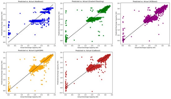 In Figure 2, the accuracy of predictions made by different machine learning models on discharge capacities of LiB is visually presented and compared. The graphical representation displays the actual discharge capacity values (Ah) on the horizontal axis and the predicted discharge capacity values (Ah) on the vertical axis. In an ideal scenario, all points would lie on the dashed black line (y = x) drawn on the graph. As shown from the graphs in Figure 2, the results of the AdaBoost model exhibit a wide distribution, indicating low accuracy in its predictions. On the other hand, the LightGBM model demonstrated a performance closer to the actual data, with most of its predictions being very close to the actual values. Similarly, CatBoost has also produced forecasts with high accuracy.