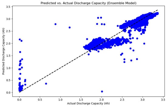 In the ensemble model, each submodel must be trained beforehand and be capable of making predictions. VotingRegressor aggregates the outputs from each of these predictors and generates the final prediction by averaging them [27]. This method may enhance overall prediction performance by leveraging the strengths of different models and balancing out the weaknesses of individual models. The ensemble model developed within the scope of the study demonstrated consistent performance among models, with 0.105 MAE, 0.020 MSE, and 0.884 R-squared. Figure 3 provides a comparison of the prediction results of the ensemble learning model with the actual results. The graph in Figure 3 illustrates that many predictions cluster around the line, indicating that the model might make predictions close to the actual values in most cases. However, there are noticeable deviations at low- and high-capacity values. It can be said that the model’s accuracy may be lower in these specific ranges. Additionally, the clustering of predictions around 1.5 Ah and 2.5 Ah indicates that the model performs better in these value ranges.